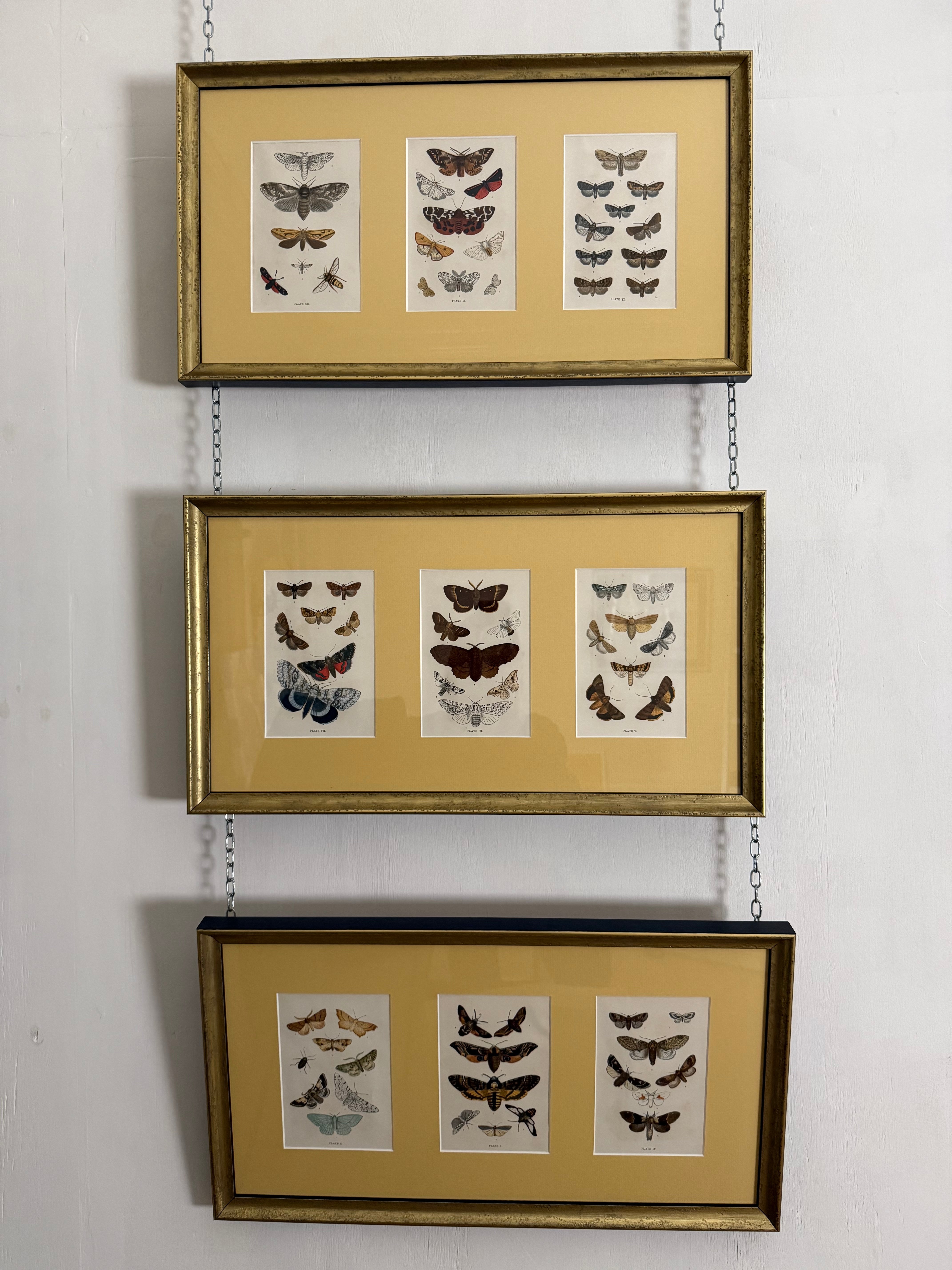 Three landscape mounts each showing three illustration of British moths. The quality of the illustration is absolutely incredible and these pictures reward close inspection. The overall effect is understated and classic. They would lovely hung on a patterned wallpaper and their unusual landscape format makes them super useful in a decorating scheme.